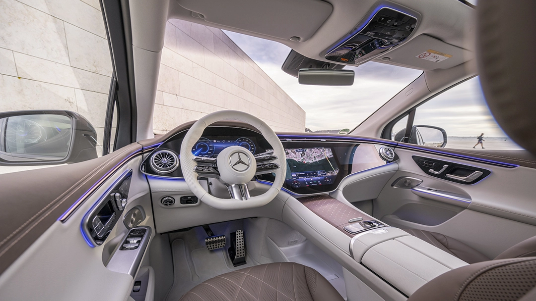 Based on the EQE sedan in positioning, the midsize SUV features a 90.6 kWh lithium-ion battery that delivers a driving range of 279 miles for the RWD EQE. However, if you step up to the AWD 4MATIC then range decreases a bit to 269 miles. Our initial charge was well within reach of the destination from Lisbon, Portugal’s capital and largest city. The vibe along the Atlantic Coast was incredibly refreshing en route to Ericeira, a civil parish and seaside community on the Western Coast considered the surfing capital of Europe. The lifestyle of fellow citizens seemed perfect for eco-friendly vehicle ownership as pastel-hued buildings from the old town express vibrant energy, the hilly streets offer daily exercise, and the fresh foods provide healthy sustenance. Moreover, Portugal is a beautiful and hospitable country that set a vitalizing tone for our electric test drive.