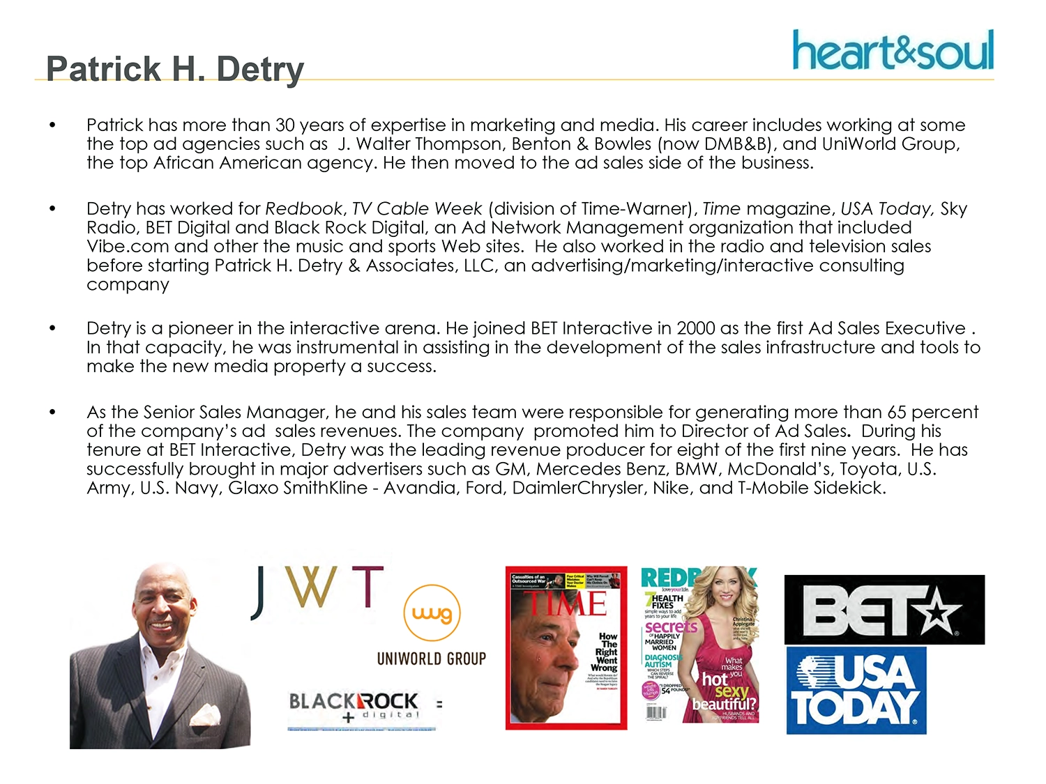 He tapped into his entrepreneurial side and with his partner and friend Clarence, they purchased Heart & Soul Publishing, where he was the EVP of Advertising Sales. Also was the Principal owner of Patrick H. Detry & Associates, LLC.